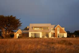 Bathed in golden light, this coastal home stands as a quiet ode to simplicity and rhythm—where gabled forms, soft textures, and vast panes gather the warmth of the horizon and the hush of the sea.