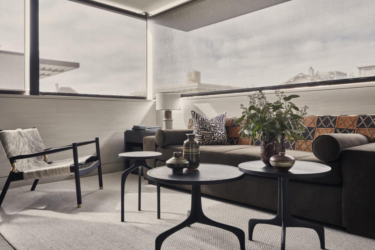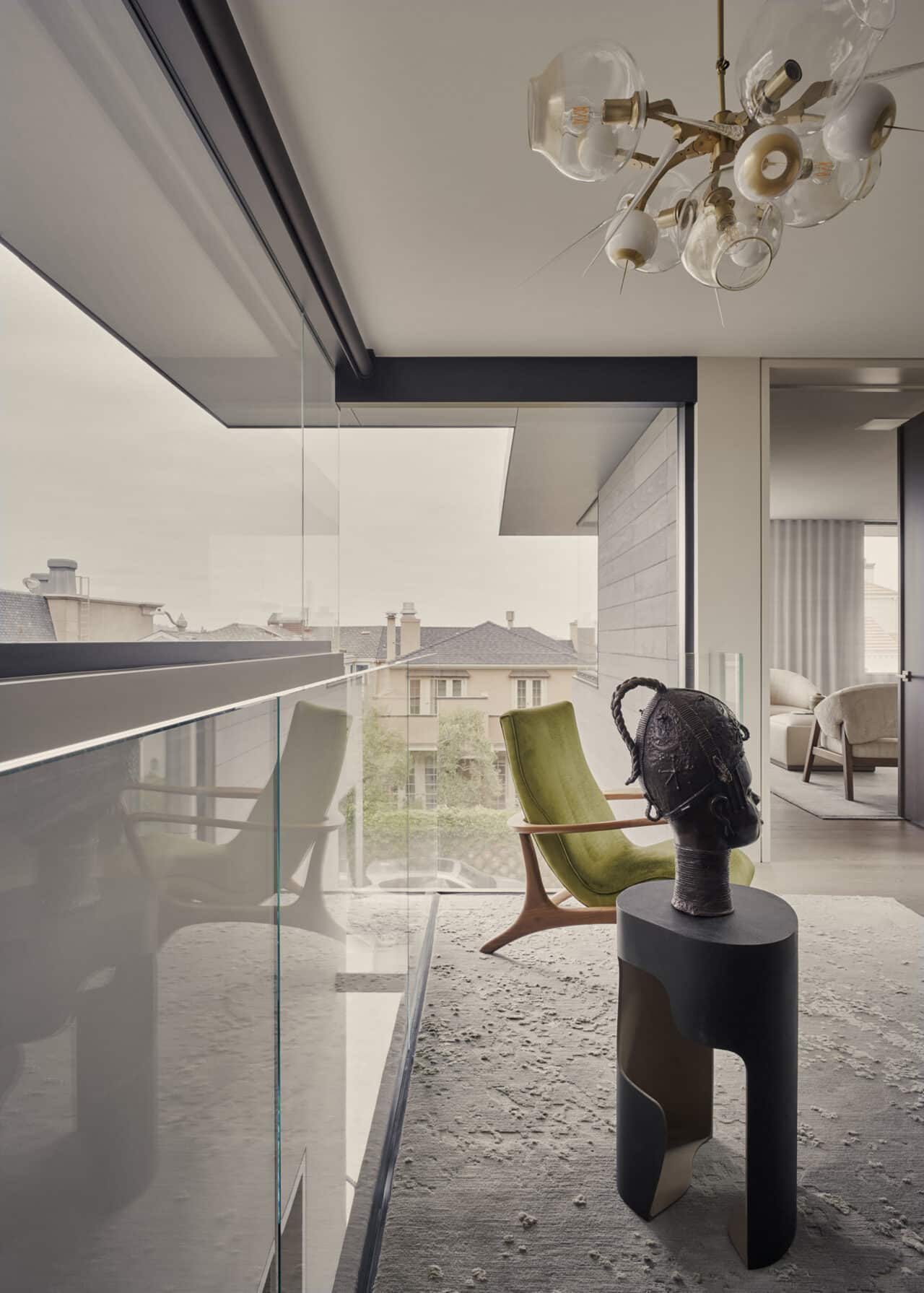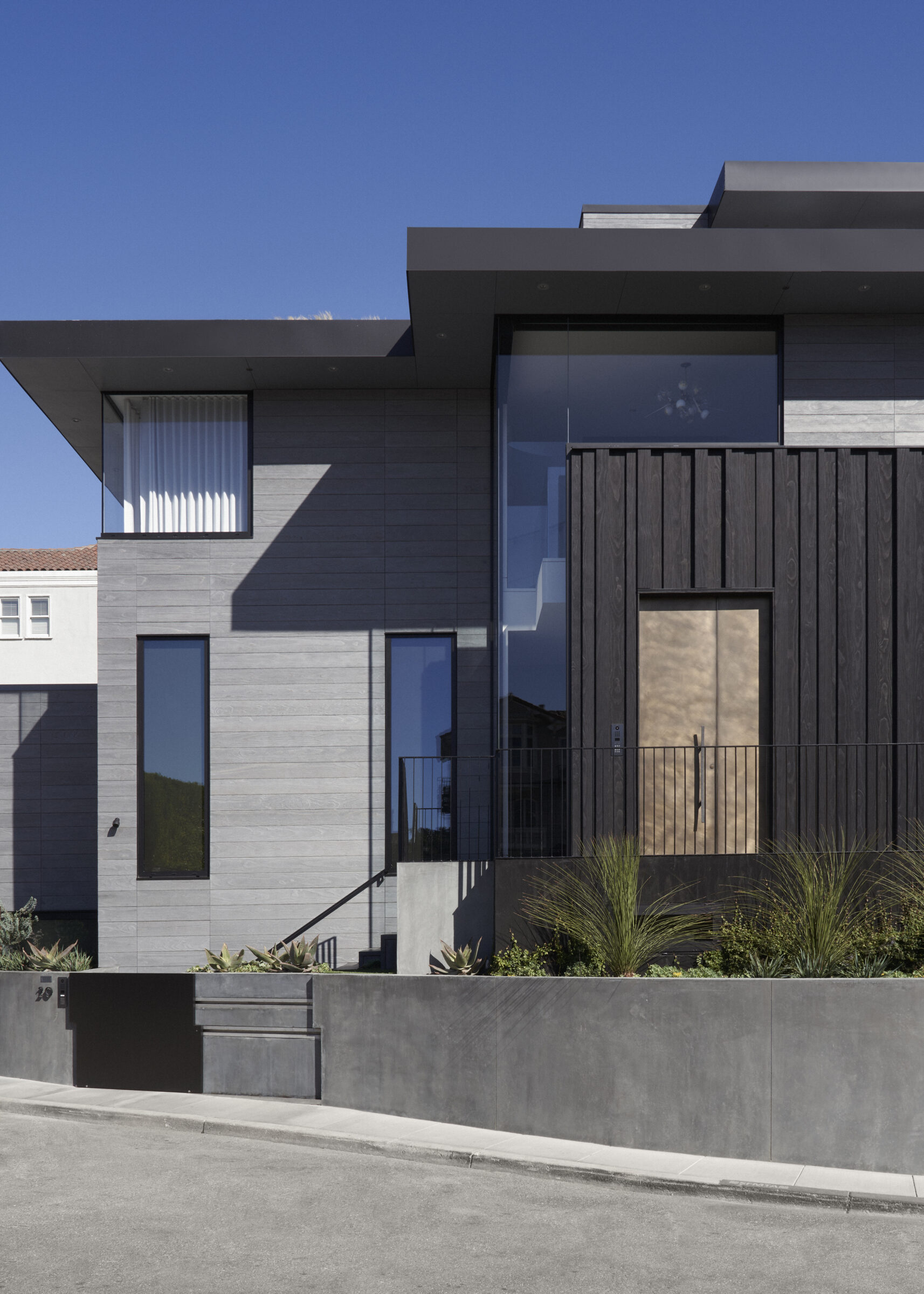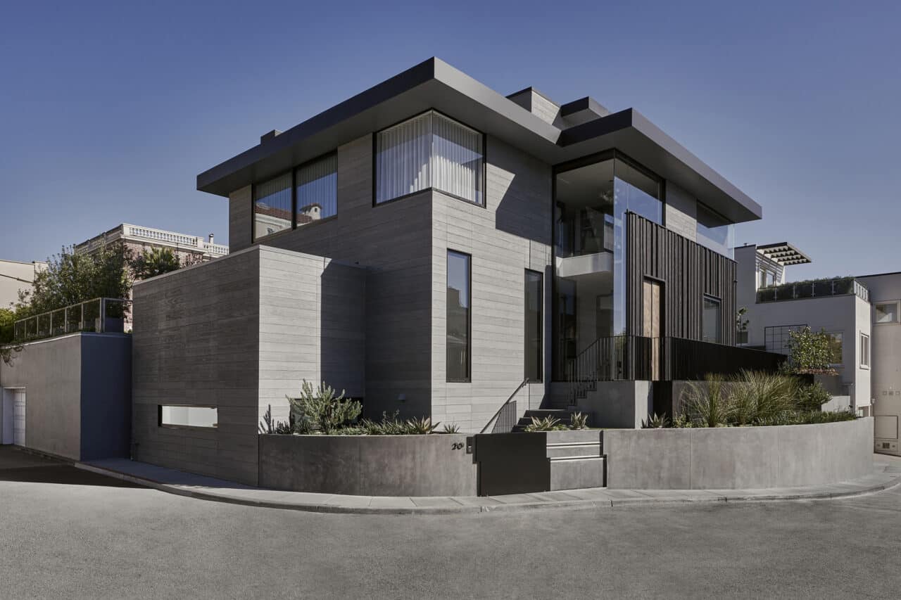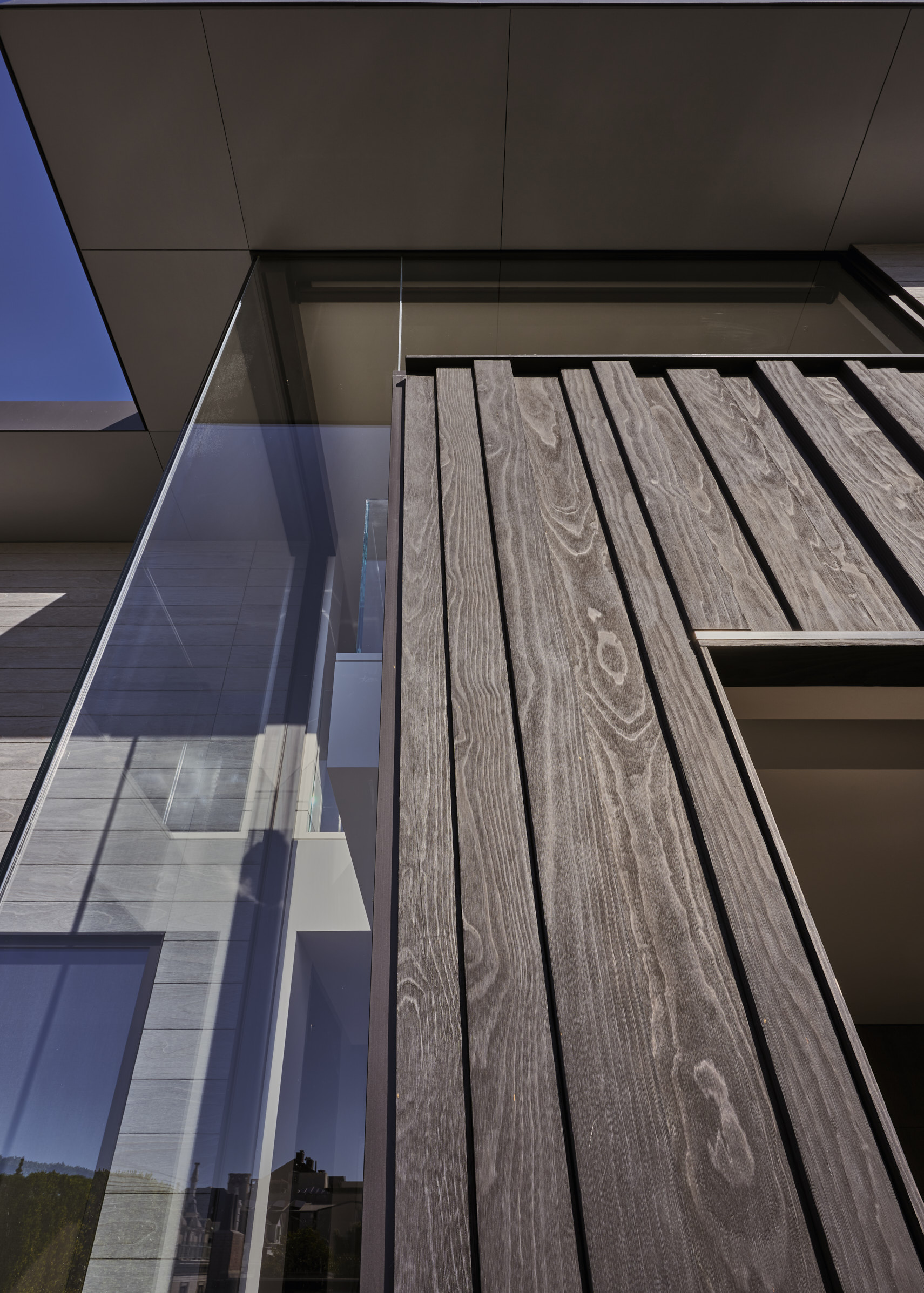 This refined urban refuge embraces its iconic location with two roof decks and penthouse views of the Golden Gate Bridge. Natural light beams throughout, including a 20’ window that spans from the main floor to the second floor. The envelope was transformed to make a statement with block-like volumes centered around a patinated bronze-clad front door. Exposed concrete and Accoya siding grace the exterior, creating an intriguing chiaroscuro effect – accenting light and darkness. To accomplish the new size and layout, the existing structure was hydraulically shored for hard rock excavation, which added a new basement below. The home features custom cabinetry and doors with a beautifully crafted, ceruse finish, while stone door portals compliment the natural color palette. The remodel also includes a water feature with stone-clad walls, an elevator, PV solar panels, an integrated lighting system and a 1,200-bottle wine room.